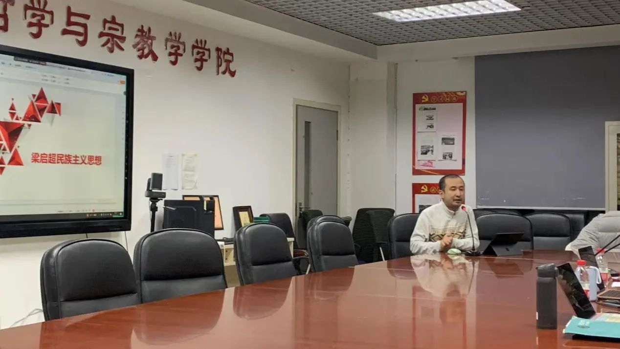 2023级文化安全专业博士研究生、入党积极分子刘中阳同志,2022级中国哲学专业博士研究生、党员赵笛舟同志,2023级中国哲学专业博士研究生、入党积极分子张小虎同志,2023级中国哲学专业博士研究生、入党积极分子刘京承同志,分别以《红色文化遗产利用与铸牢中华民族共同体意识研究》《“山水”构建:中华文明的独特叙事与文化表征》《从王弼论“一”来看铸牢中华民族共同体意识》《梁启超的民族主义思想》为题,就如何从本专业视角对“铸牢中华民族共同体意识”相关问题进行学理化阐释,作了主题汇报。